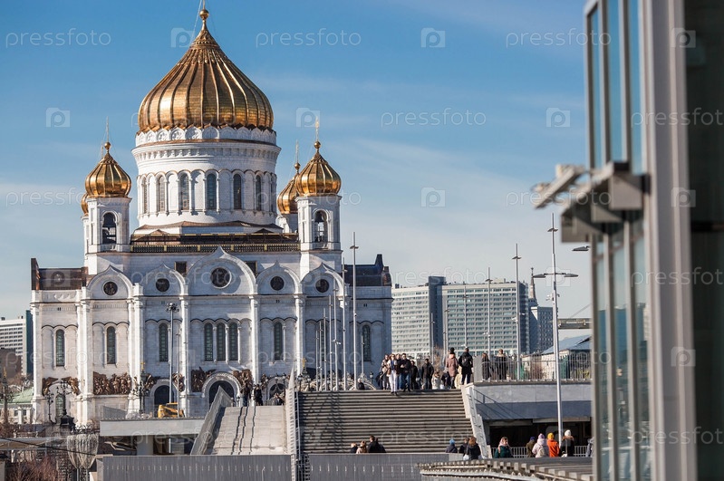 Русский православный собор - собор Христа Спасителя в Москве на фоне голубого неба в солнечный весенний день. Российская Федерация, Москва