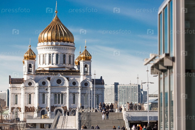 Русский православный собор - собор Христа Спасителя в Москве на фоне голубого неба в солнечный весенний день. Российская Федерация, Москва
