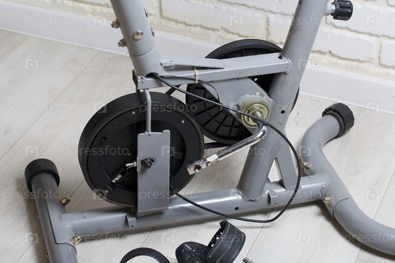 Элементы велотренажера. Обслуживание приводного шкива и маховика. Крупный план