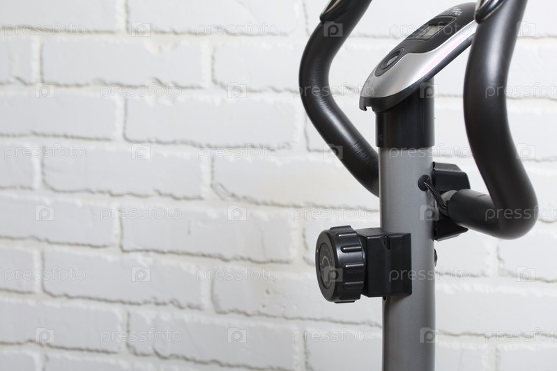 Элементы велотренажера. Датчики и дисплей на руле. На фоне белой кирпичной стены. Крупный план