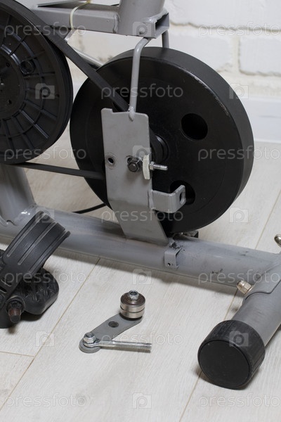 Элементы велотренажера. Обслуживание приводного шкива и маховика. Крупный план