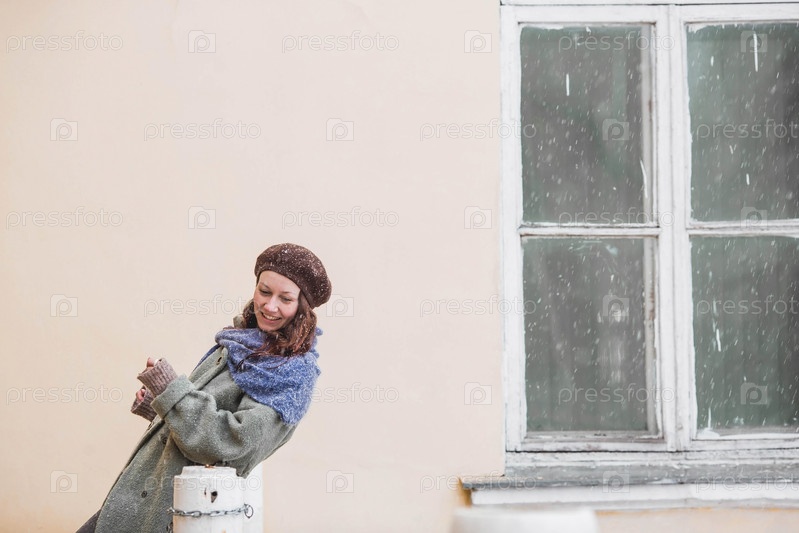 Портрет милой молодой женщины в берете ранней весной на открытом воздухе. Девушка с распущенными волосами и в длинном пальто на фоне старинной усадьбы