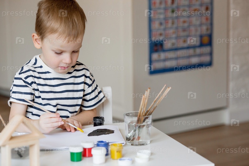 Маленький мальчик 3 лет рисует на бумаге. Детские игры для развития ребенка. Детский сад