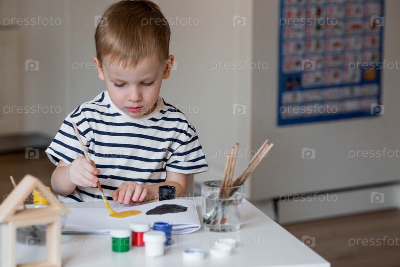 Маленький мальчик 3 лет рисует на бумаге. Детские игры для развития ребенка. Детский сад