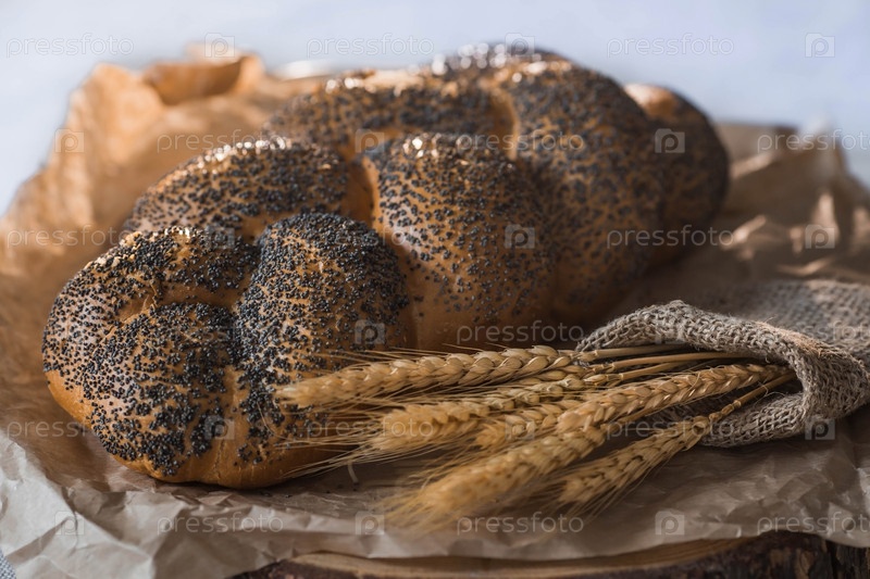 Классическая пшеничная коса с маком. Вкусный хлеб крупным планом. Свежеиспеченный хлеб на закваске с золотой корочкой на деревянной доске. Контекст пекарни с вкусным хлебом. Кондитерские изделия