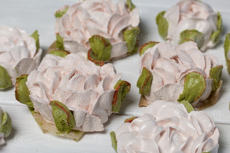 Цветы зефира на белых досках. Зефир домашний. Крупный план
