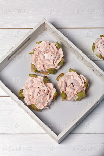 Цветы зефира на белых досках. Зефир домашний. Крупный план