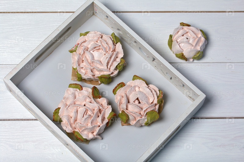 Цветы зефира на белых досках. Зефир домашний. Крупный план
