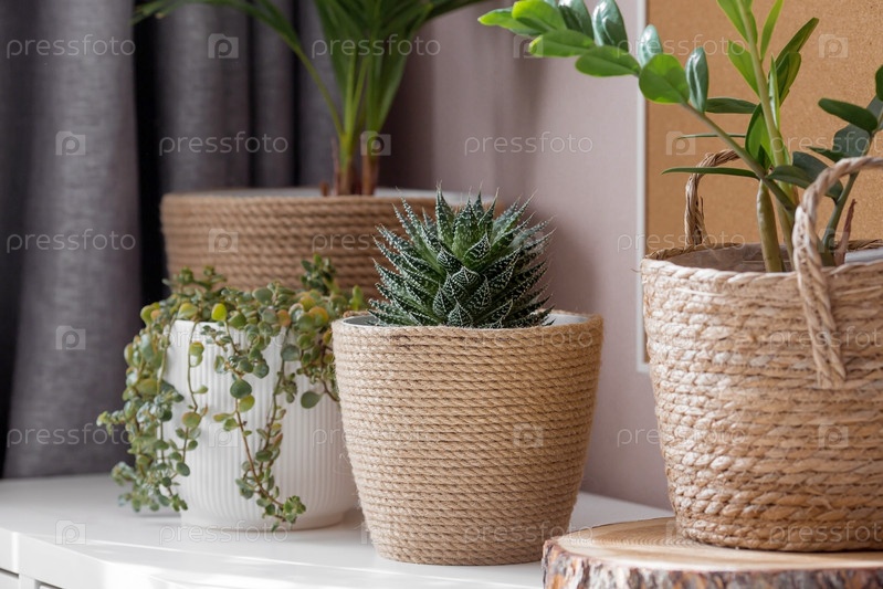 Садоводство, домашнее хозяйство и растениеводство. Многие комнатные растения растут в цветочных горшках в интерьере комнаты. Уход за цветком