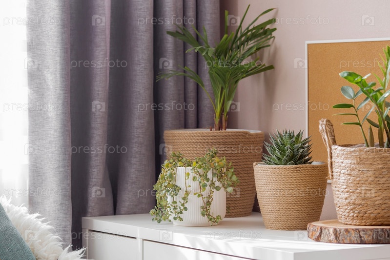 Садоводство, домашнее хозяйство и растениеводство. Многие комнатные растения растут в цветочных горшках в интерьере комнаты. Уход за цветком