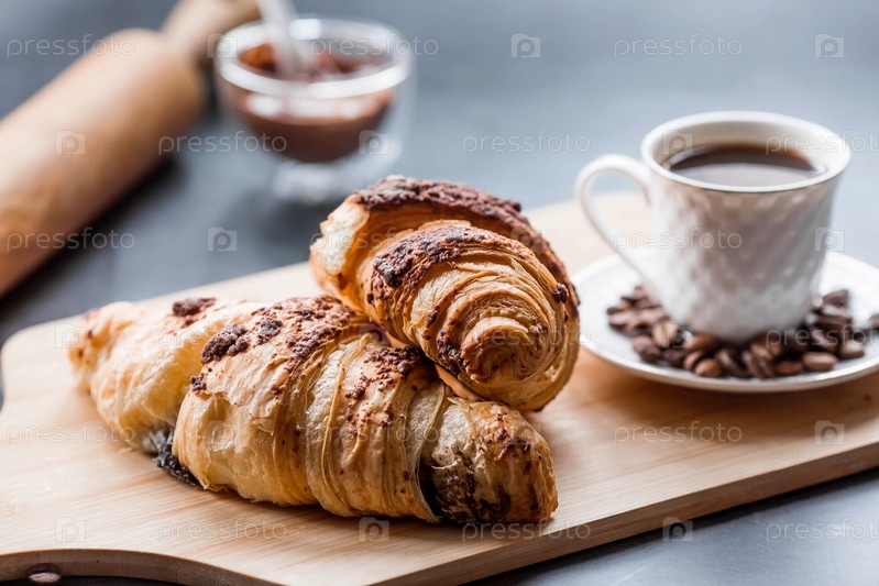 Вкусные свежеиспеченные круассаны с шоколадом и кофе на темном фоне. Французский завтрак. Вкусная выпечка крупным планом. Контекст пекарни с вкусным хлебом. Кондитерские изделия