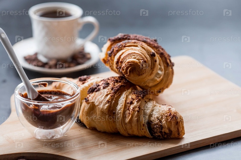 Вкусные свежеиспеченные круассаны с шоколадом и кофе на темном фоне. Французский завтрак. Вкусная выпечка крупным планом. Контекст пекарни с вкусным хлебом. Кондитерские изделия