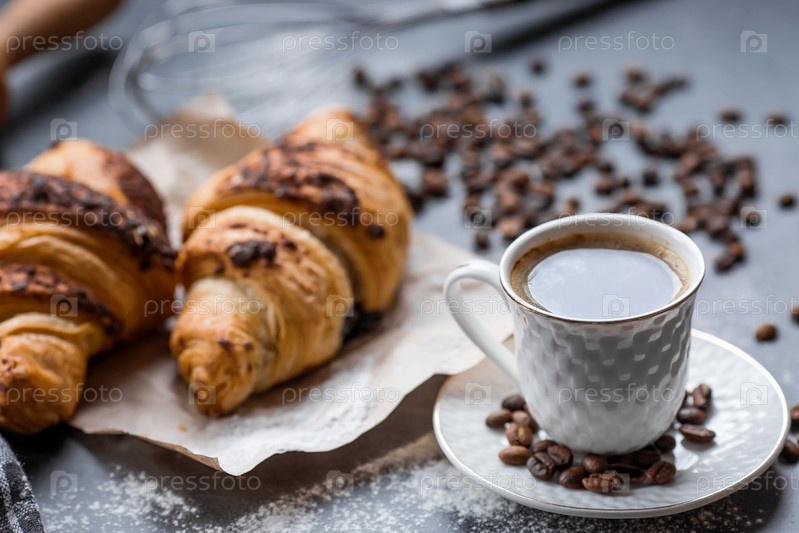 Вкусные свежеиспеченные круассаны с шоколадом и кофе на темном фоне. Французский завтрак. Вкусная выпечка крупным планом. Контекст пекарни с вкусным хлебом. Кондитерские изделия