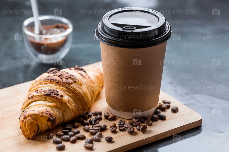 Вкусные свежеиспеченные круассаны с шоколадом и кофе на темном фоне. Французский завтрак. Вкусная выпечка крупным планом. Контекст пекарни с вкусным хлебом. Кондитерские изделия
