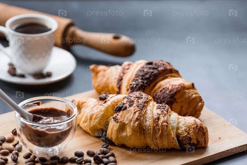 Вкусные свежеиспеченные круассаны с шоколадом и кофе на темном фоне. Французский завтрак. Вкусная выпечка крупным планом. Контекст пекарни с вкусным хлебом. Кондитерские изделия