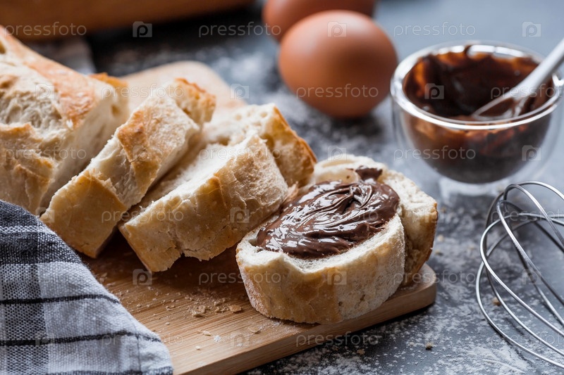 Вкусный свежеиспеченный багет с шоколадом на темном фоне. Французский завтрак. Вкусная выпечка крупным планом. Контекст пекарни с вкусным хлебом. Кондитерские изделия