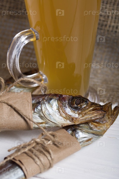 Путассу холодного копчения. Рыба обернута полоской бумаги. Обвязан льняной бечевкой. Стекло с пивом. Крупный план