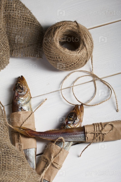 Путассу холодного копчения. Рыба обернута полоской бумаги. Обвязан льняной бечевкой. Рядом лежит льняная ткань и моток шпагата. Крупный план