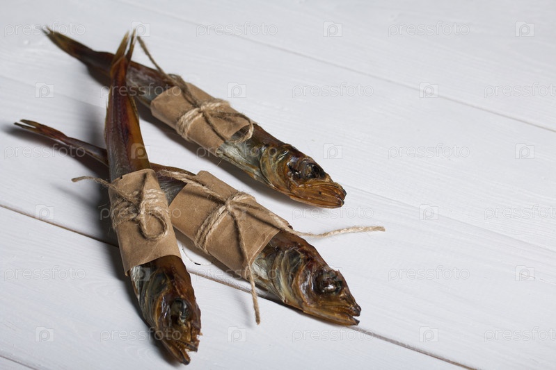 Путассу холодного копчения. Рыба обернута полоской бумаги. Обвязан льняной бечевкой. Крупный план