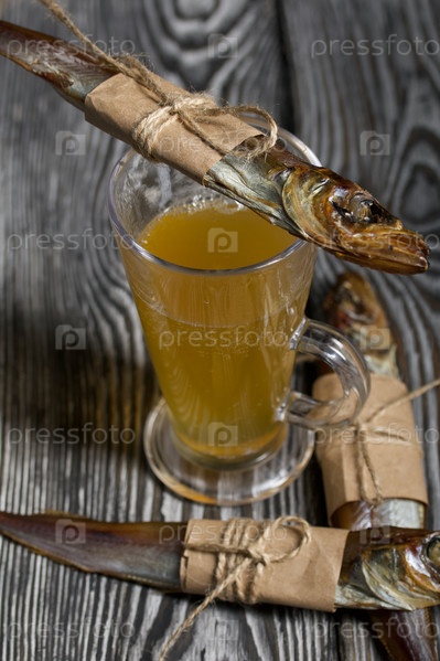 Путассу холодного копчения. Рыба обернута полоской бумаги. Обвязан льняной бечевкой. Лежит на сосновых досках. Стекло с пивом. Крупный план