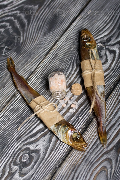 Путассу холодного копчения. Рыба обернута полоской бумаги. Обвязан льняной бечевкой. Лежит на сосновых досках. Перевернутая банка с крупной солью. Крупный план