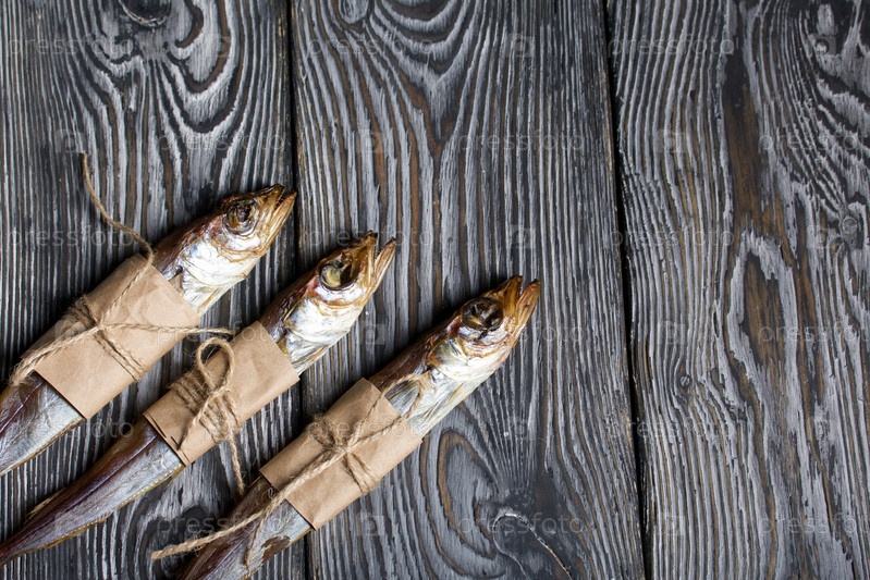 Путассу холодного копчения. Рыба обернута полоской бумаги. Обвязан льняной бечевкой. Лежит на сосновых досках. Крупный план