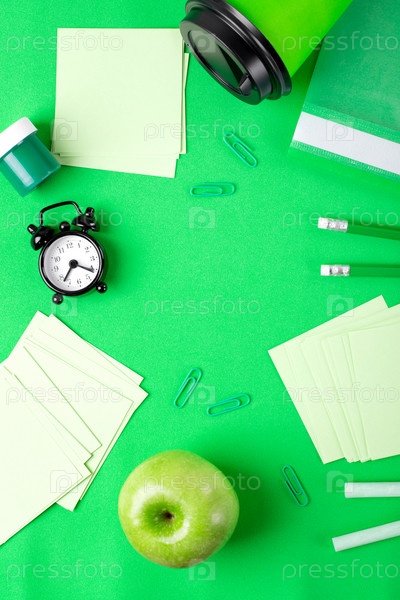 Обратно в школу квартира лежала в зелени. Фон с канцелярскими принадлежностями, будильником и яблоком создает пространство для копирования