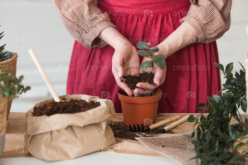 Молодая женщина в комнате крупным планом тщательно ухаживает, пересаживает и поливает комнатные растения. Кавказская счастливая девушка любит сажать и поливать цветы в интерьере кухни