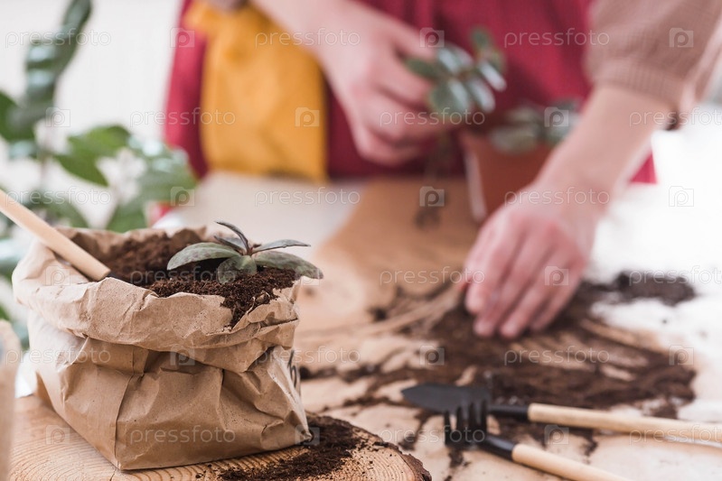 Молодая женщина в винтажной одежде в интерьере кухни бережно ухаживает, пересаживает и поливает комнатные растения. Руки девушки и растения крупным планом. Сад