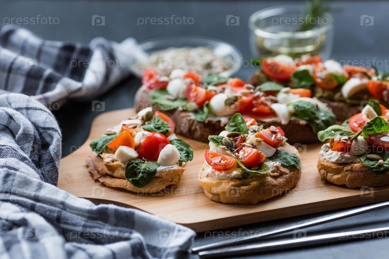 Брускетта (бутерброды) с помидорами черри, сыром моцарелла и зеленью на разделочной доске на темном фоне. Традиционная итальянская закуска