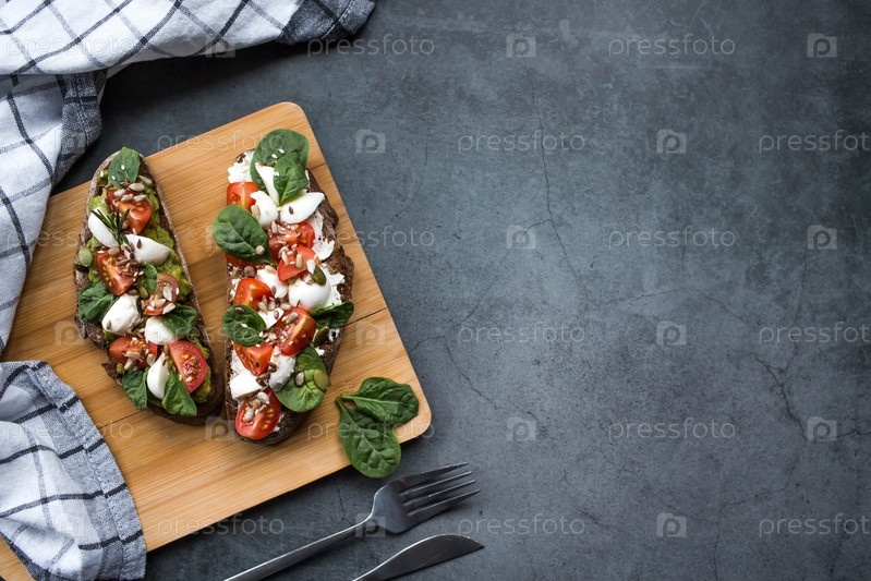 Брускетта (бутерброды) с помидорами черри, сыром моцарелла и зеленью на разделочной доске на темном фоне. Традиционная итальянская закуска