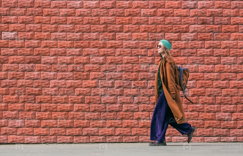 Портрет молодой 30-летней хипстерши в солнцезащитных очках и стильной одежде в городе на фоне кирпичной стены. Современный образ жизни