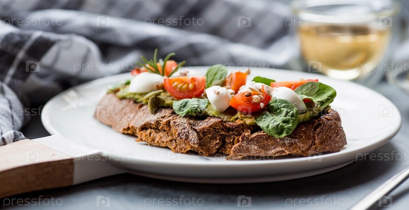 Брускетта (бутерброды) с помидорами черри, сыром моцарелла и зеленью на разделочной доске на темном фоне. Традиционная итальянская закуска