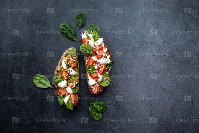 Брускетта (бутерброды) с помидорами черри, сыром моцарелла и зеленью на разделочной доске на темном фоне. Традиционная итальянская закуска