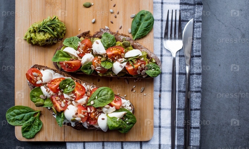 Брускетта (бутерброды) с помидорами черри, сыром моцарелла и зеленью на разделочной доске на темном фоне. Традиционная итальянская закуска