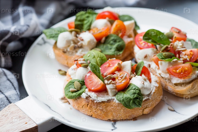 Брускетта (бутерброды) с помидорами черри, сыром моцарелла и зеленью на разделочной доске на темном фоне. Традиционная итальянская закуска