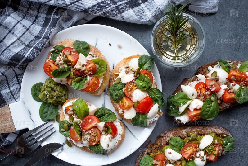 Брускетта (бутерброды) с помидорами черри, сыром моцарелла и зеленью на разделочной доске на темном фоне. Традиционная итальянская закуска
