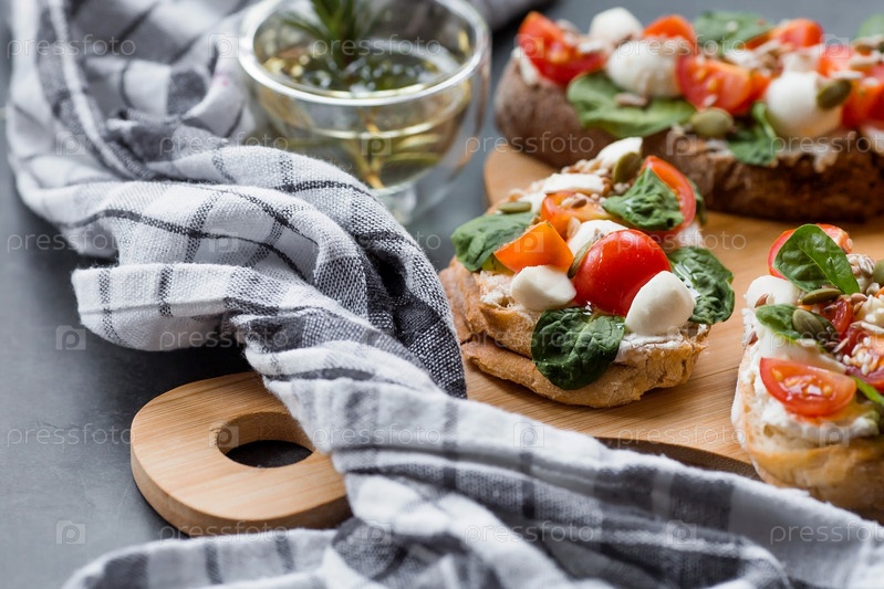 Брускетта (бутерброды) с помидорами черри, сыром моцарелла и зеленью на разделочной доске на темном фоне. Традиционная итальянская закуска