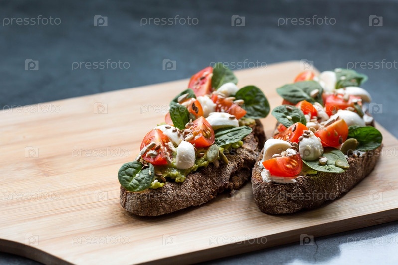 Брускетта (бутерброды) с помидорами черри, сыром моцарелла и зеленью на разделочной доске на темном фоне. Традиционная итальянская закуска