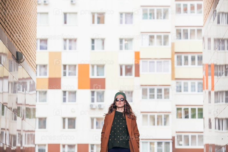 Портрет молодой 30-летней хипстерши в солнцезащитных очках и стильной одежде в городе на фоне кирпичной стены. Современный образ жизни