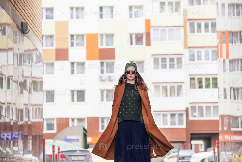 Портрет молодой 30-летней хипстерши в солнцезащитных очках и стильной одежде в городе на фоне кирпичной стены. Современный образ жизни