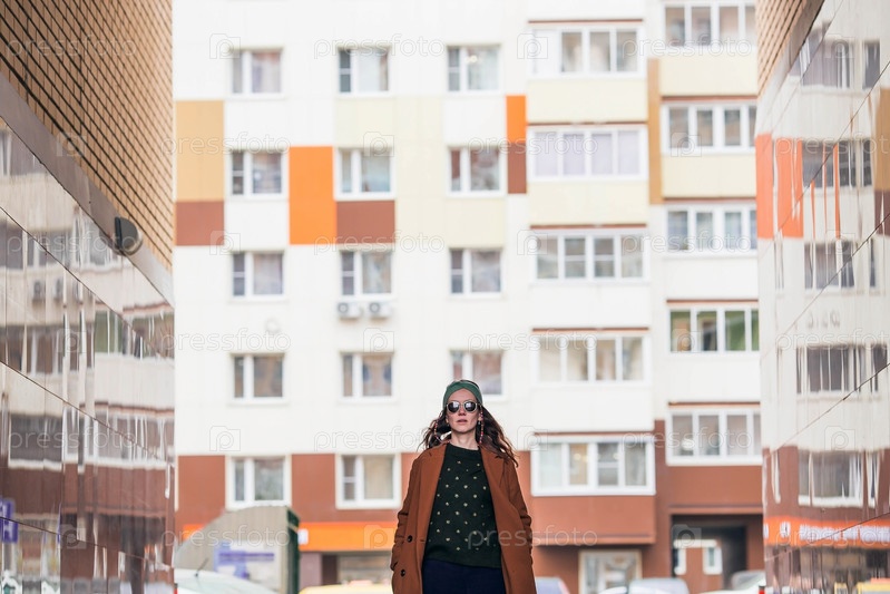 Портрет молодой 30-летней хипстерши в солнцезащитных очках и стильной одежде в городе на фоне кирпичной стены. Современный образ жизни