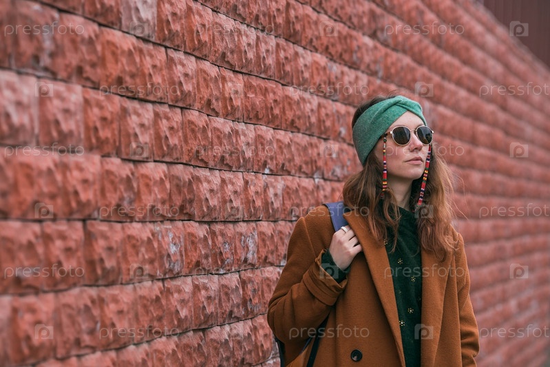 Портрет молодой 30-летней хипстерши в солнцезащитных очках и стильной одежде в городе на фоне кирпичной стены. Современный образ жизни