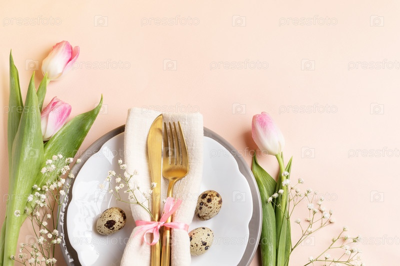 Перепелиные яйца, золотые столовые приборы в салфетке на тарелках, розовые тюльпаны, гипсофила на светло-персиковом. Скопируйте пространство