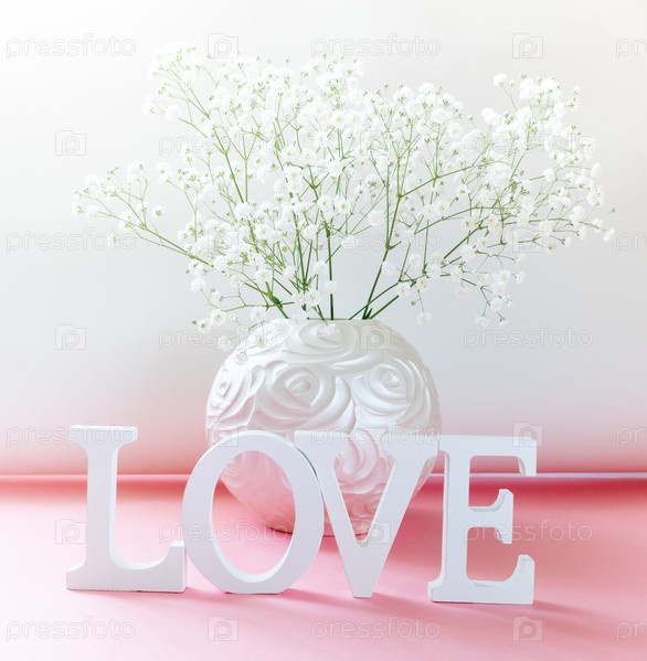 Белые буквы LOVE с круглой вазой из белых цветов гипсофила на розово-белом фоне.Креативная праздничная открытка на День святого Валентина, День матери, 8 марта или день рождения.Закрыть