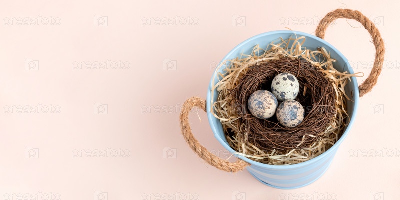 Праздничный пасхальный минимальный баннер. Перепелиные яйца в гнезде в маленьком синем ведре на пастельно-розовом фоне. Горизонтальная ориентация. Вид сверху. Макет. Скопируйте пространство