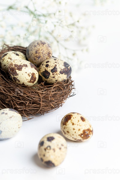Весенняя пасхальная открытка. Перепелиные яйца в гнезде и рядом с ним, белые цветы гипсофилы на белом фоне. Вертикальная ориентация. Выборочный фокус