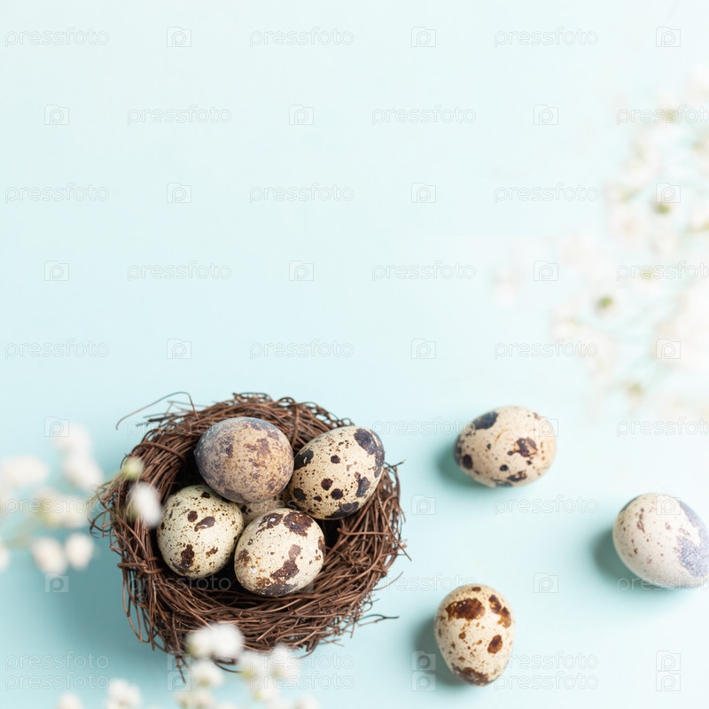 Перепелиные яйца в гнезде и рядом с ним, белые цветы гипсофилы на пастельно-голубом фоне. Весенняя пасхальная открытка. Скопируйте место для текста. Квадратное фото. Вид сверху