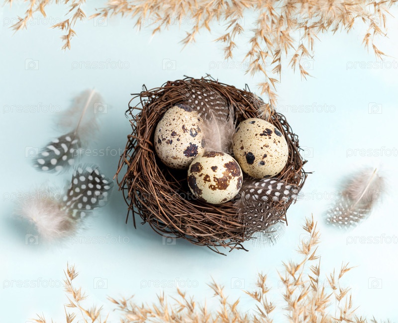 Перепелиные яйца в гнезде, перья в рамке из сухой травы на голубом. Пасхальная открытка. Вид сверху. Плоская укладка