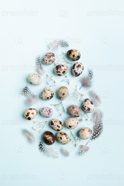 Перепелиные яйца, перья, белые цветы гипсофилы, выложенные как пасхальное яйцо на голубом. Вид сверху